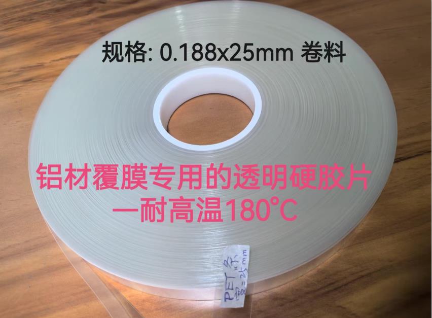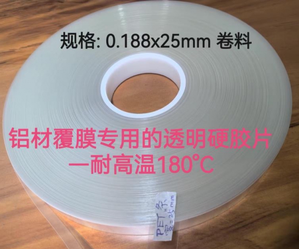 铝材覆膜胶条,采用耐高温180°C的透明PET膜,经过精密裁切而成,是铝材覆膜的专用胶条。
